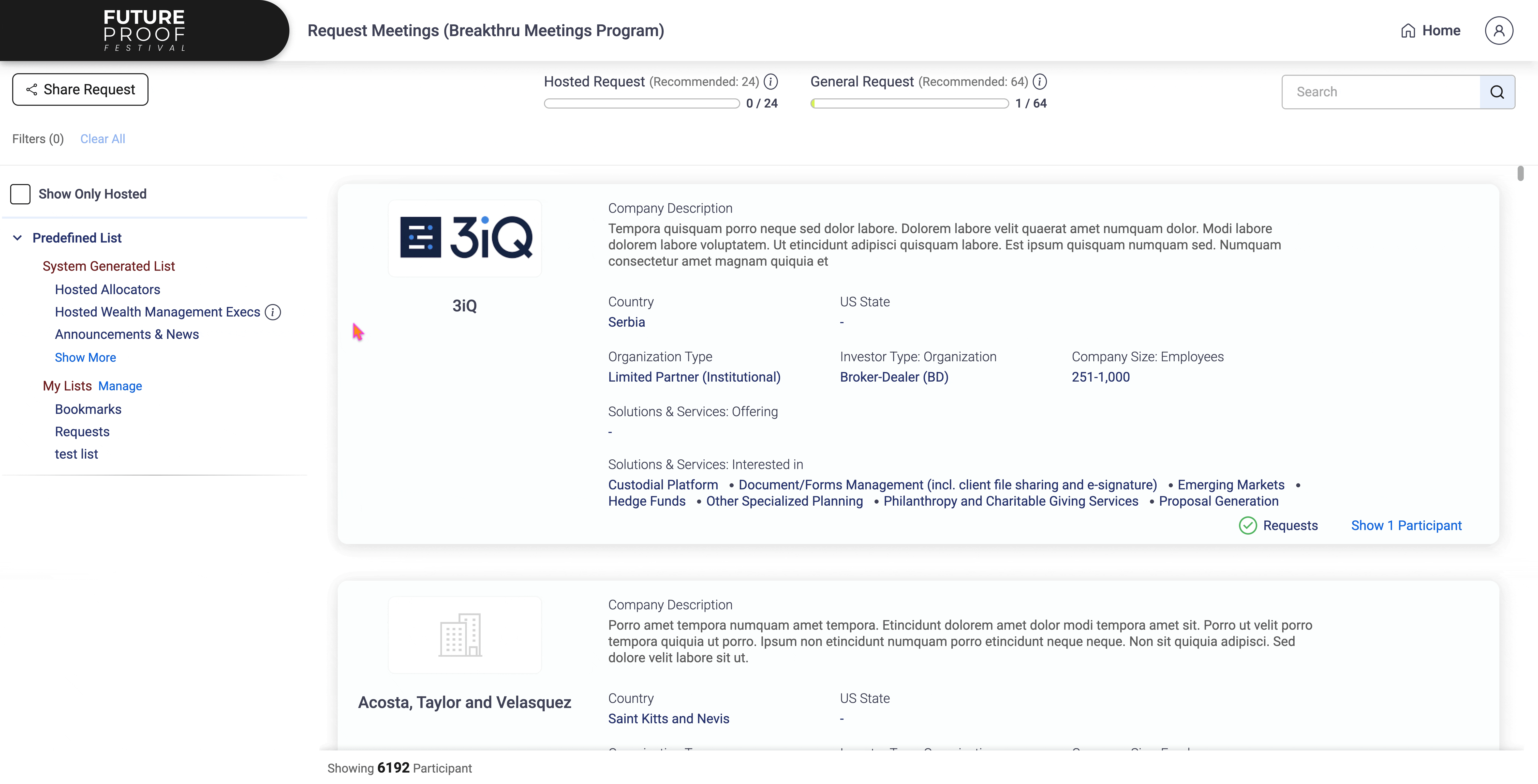 - Select all Hosted Financial Advisors, Limited Partners & UHNW Investors you’d like to meet.